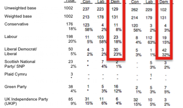 Secondly, and potentially much more significantly, is the question of why the unweighted sample was so unrepresentative. If a lot of people were indeed out shopping, it follows that there is a significant risk those that were home to answer their landlines could have been unusually unrepresentative of the 2010 Lib Dem cell as a whole. The split (by current voting intention, with DK/refusals left in) of 3% Tory 18% Labour and 32% Lib Dem is starkly different from November’s 8%/15%/23%, which was also very much in line with what other pollsters have been showing. Once you adjust for the “Don’t knows”, this explains the bulk of the swing.