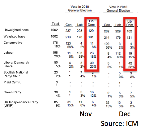 But regardless of whether poor response rates were the cause of the delay, a look at the tables shows something interesting. Like most phone pollsters, ICM weight by recalled 2010 vote, with adjustments. They work with a sample of around 1,000 voters that needs to contain 131 that voted Lib Dem in 2010. In November, their raw poll contained 129 such voters, so the weighting adjustment needed to achieve a representative sample was extremely small. In December, however, the raw sample contained only 102 such respondents, requiring a rather hefty 28% weighting-up.