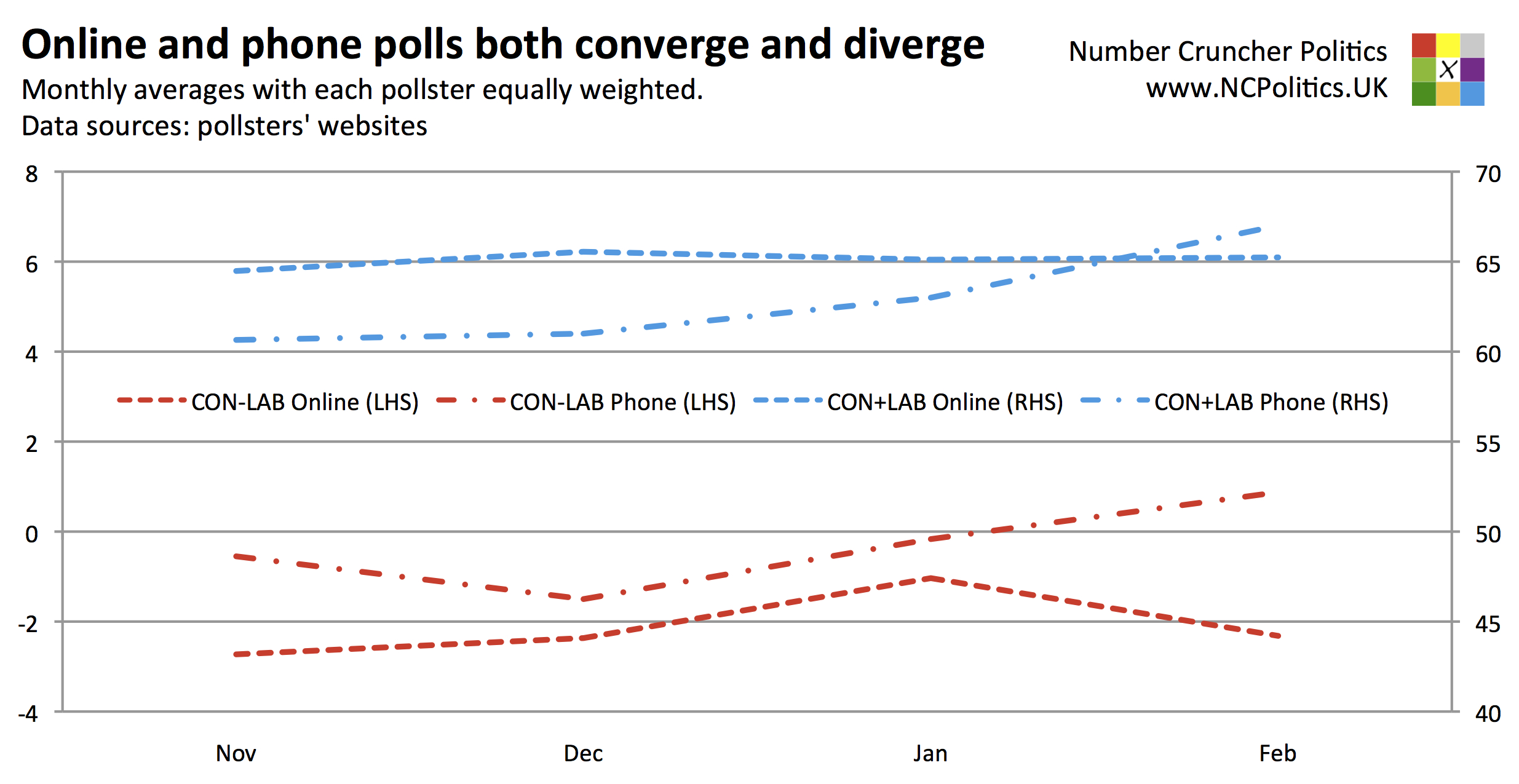 One area where the two methods were producing substantially different results a few months ago was in the combined vote share of the two largest parties. In the chart below, the blue lines (right-hand scale) show a consistent share of about 65% in online polling, whereas phone polls had shown a combined share 4-5 points lower than online polls in at the end of 2014, but were two points higher this month. The rise was was fairly constant across the individual pollsters.