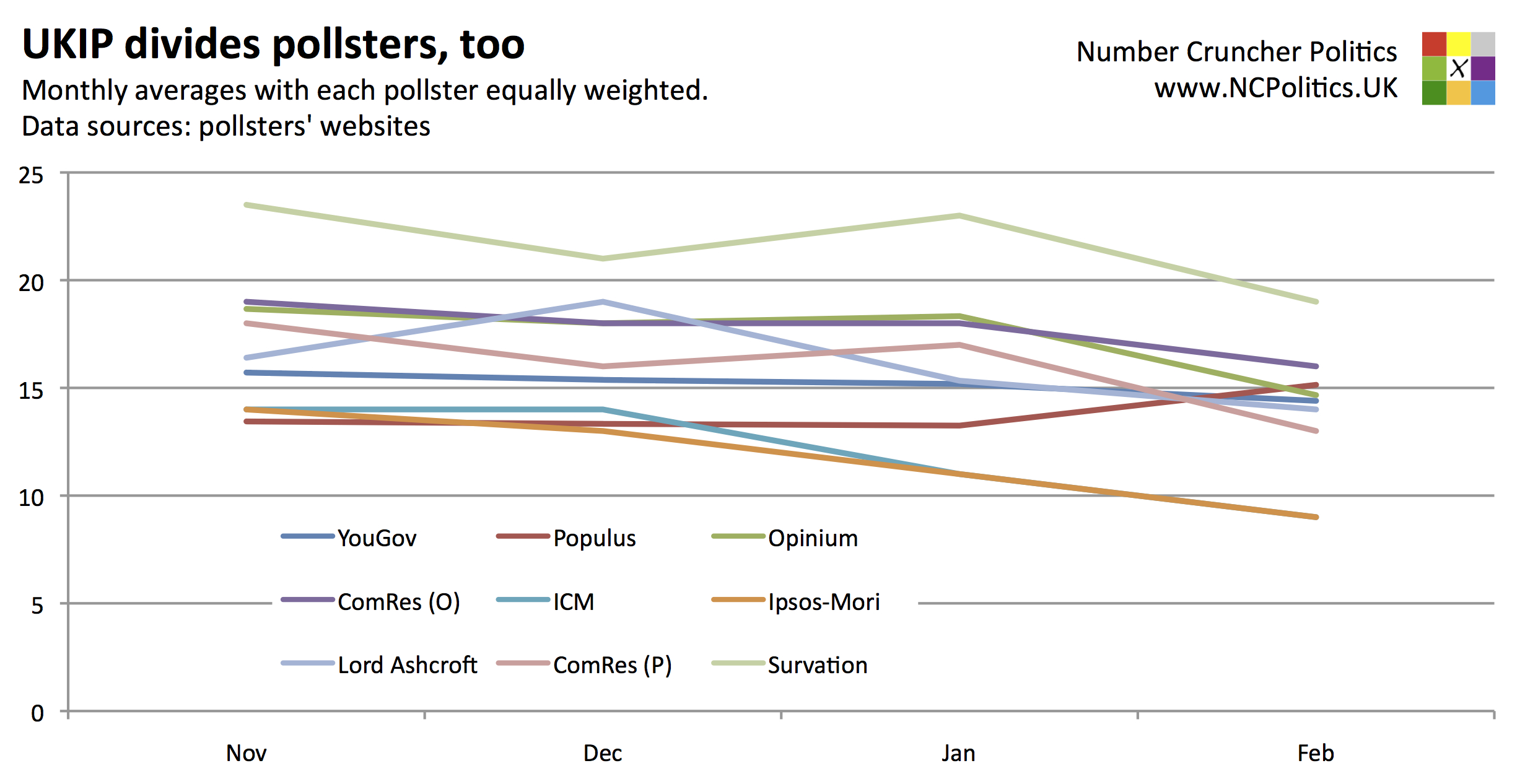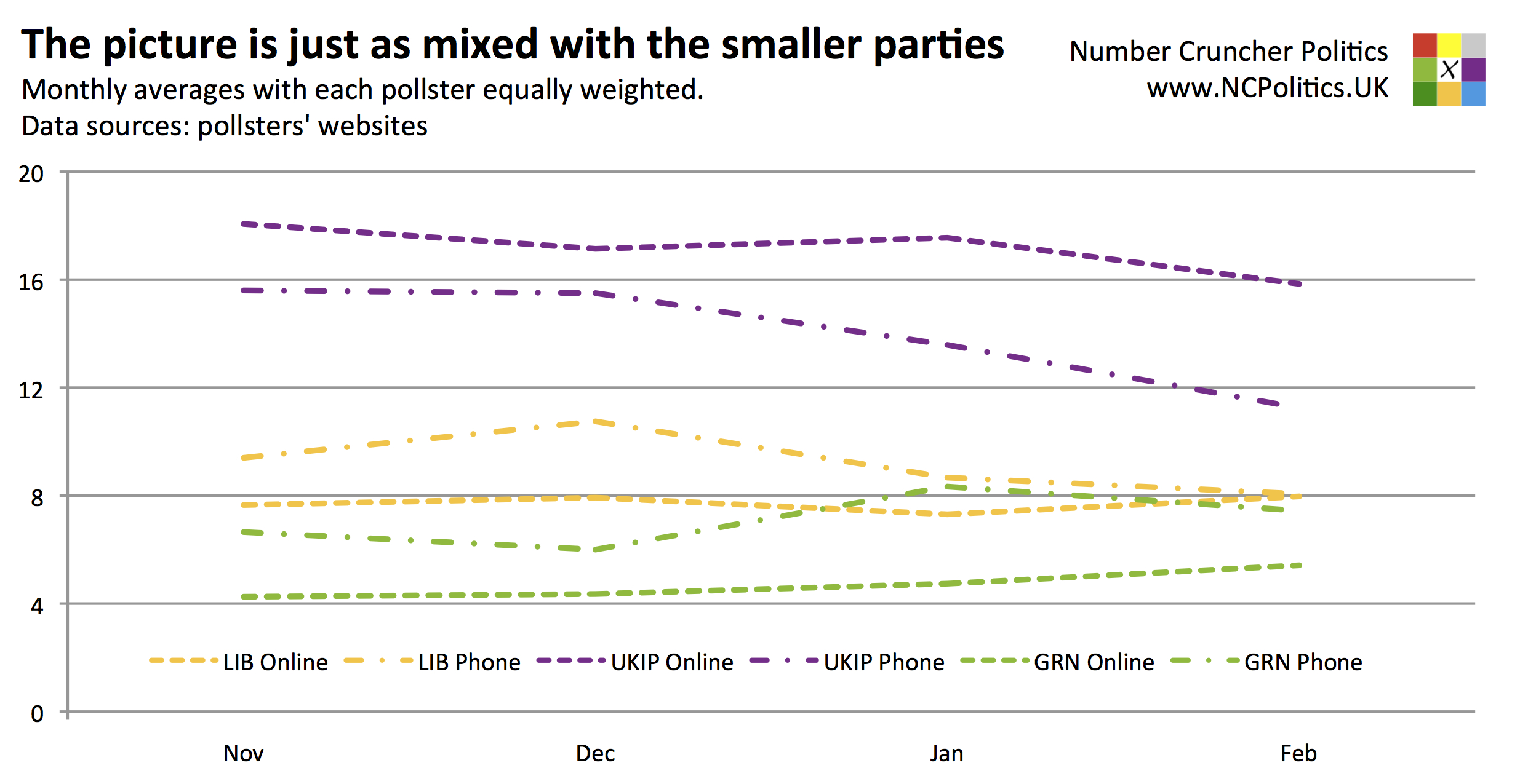 The Greens are probably the hardest party to do polling on, simply because their support is as much as eight times larger than at the last election, making past-vote weighting a rather blunt tool. As such, sample quality becomes extremely important – the above chart illustrates consistently higher Green support in phone polls, but while phone pollsters are fairly consistent (all between 7% and 8% in February) the online polls this month have ranged from 4% with Survation and ComRes to 7% with Opinium and YouGov. Overall the pattern is one of continued Green growth at the Lib Dems’ expense, but at a slower pace than in January.
