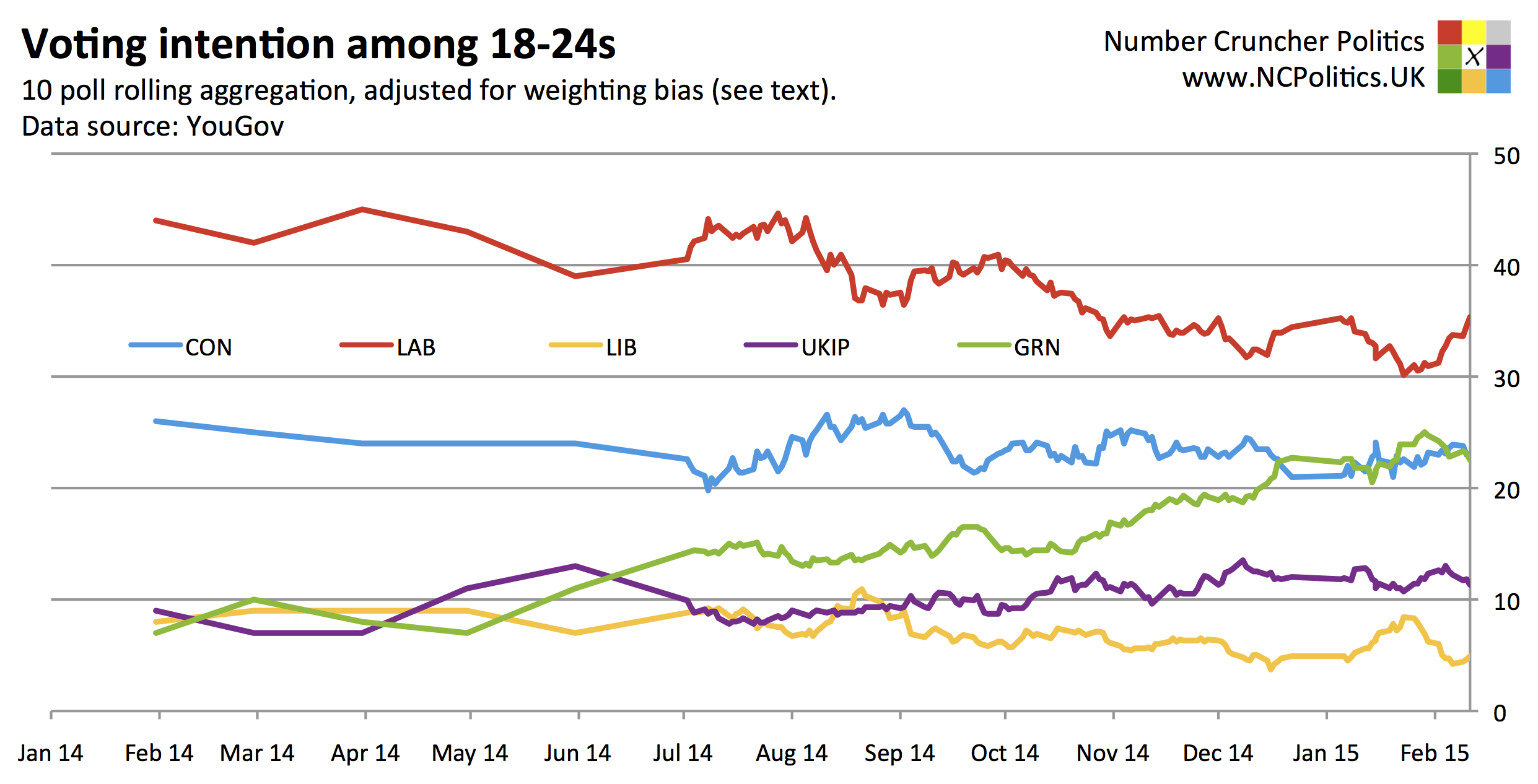Elsewhere, among under-25s generally, my weighting bias-adjusted YouGov aggregation found toplines of CON 23 (=) LAB 35 (+5) LIB 5 (-3) UKIP 11 (=) GRN 23 (-1). This might suggest that last time’s moves (mainly Lib-Lab switching) were just a blip – remember that in addition to the normal margin of error, the weighting bias is only an estimate. But in any case, Labour continue to lead, with the Greens and Conservatives close for 2nd.