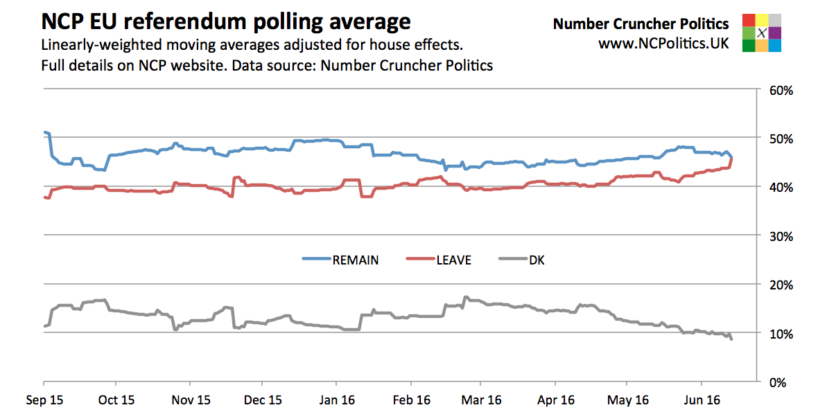 I say “may” because we haven’t heard recently from the other two experienced phone pollsters, Ipsos MORI (expected in the Evening Standard on Tuesday or Wednesday) and ComRes, who will have at least one more poll before next the 23rd of June. ORB’s phone poll still showed a 5 point Remain lead, compared to a 10 point Leave lead in its online poll, but I would put more weight on ICM.