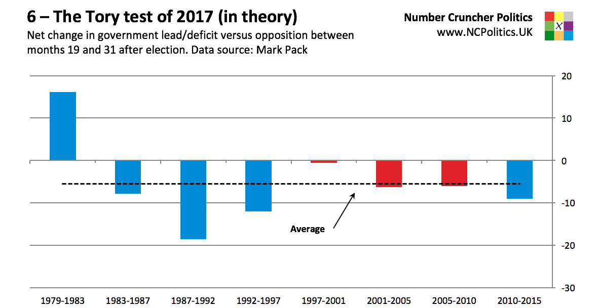 What might we expect in 2017? That is tough to say, and there are plenty of tail risks. But what usually happens to governing parties between 19 and 31 months after election victory is a net loss of (on average) about 6 points, or a 3% swing to the opposition, and the move has been in that direction every time since 1983. So on that basis we might expect a Tory lead in the upper single digits this time next year, though for obvious reasons there is plenty of uncertainty around that!