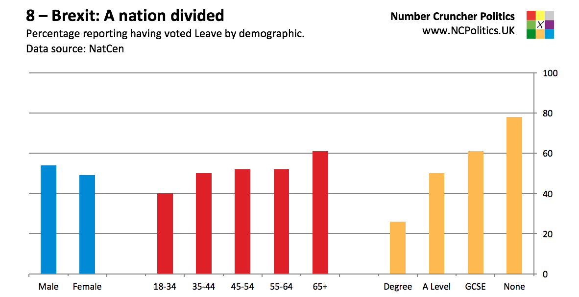 Trying to unpick what happened on the 23rd of June is made trickier by the significance of the role played by people that don’t normally vote, a group that presents problems for pollsters. The NatCen probability sample-based panel did pretty well on that front – here are its figures show stark divides by age and education.