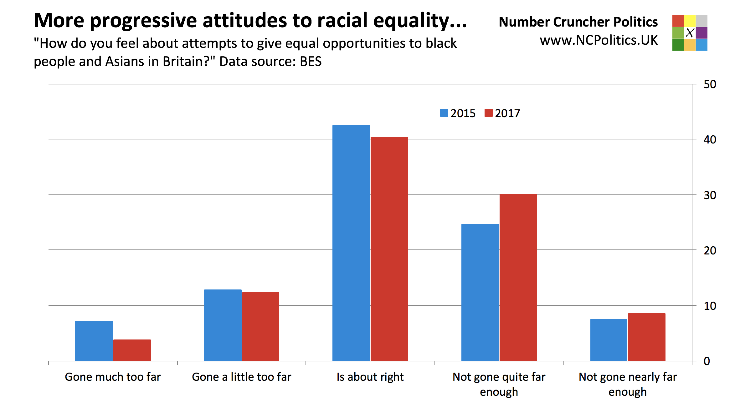 Well, they seem to have become more socially liberal since 2015, with more people thinking it needs to go further and fewer thinking the reverse: