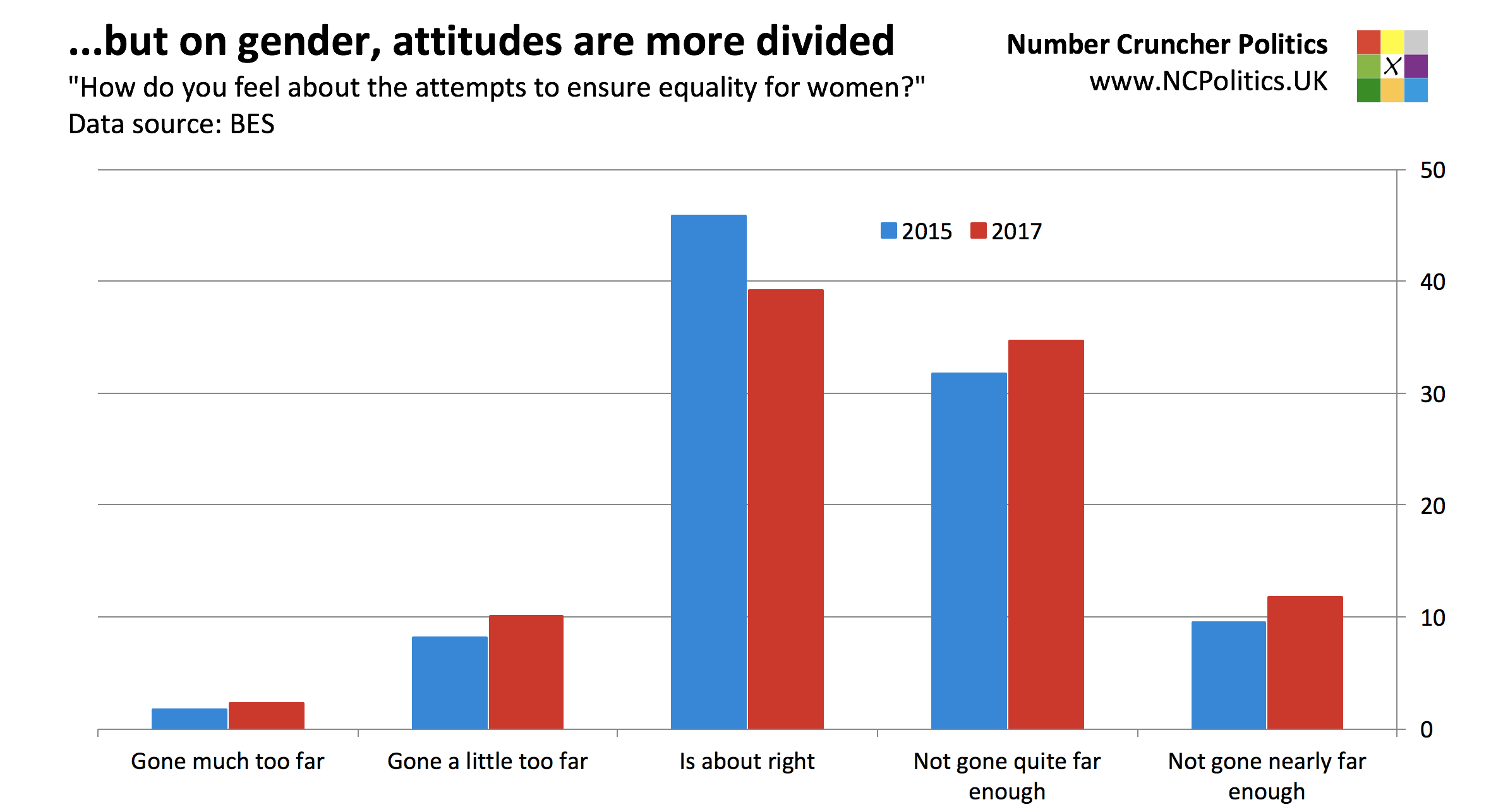 On gender equality, the trends seems to be towards greater polarisation, rather than in either direction. More now say it needs to go further than in 2015 (though they are still a minority). But at the same time, more feel it’s gone too far: