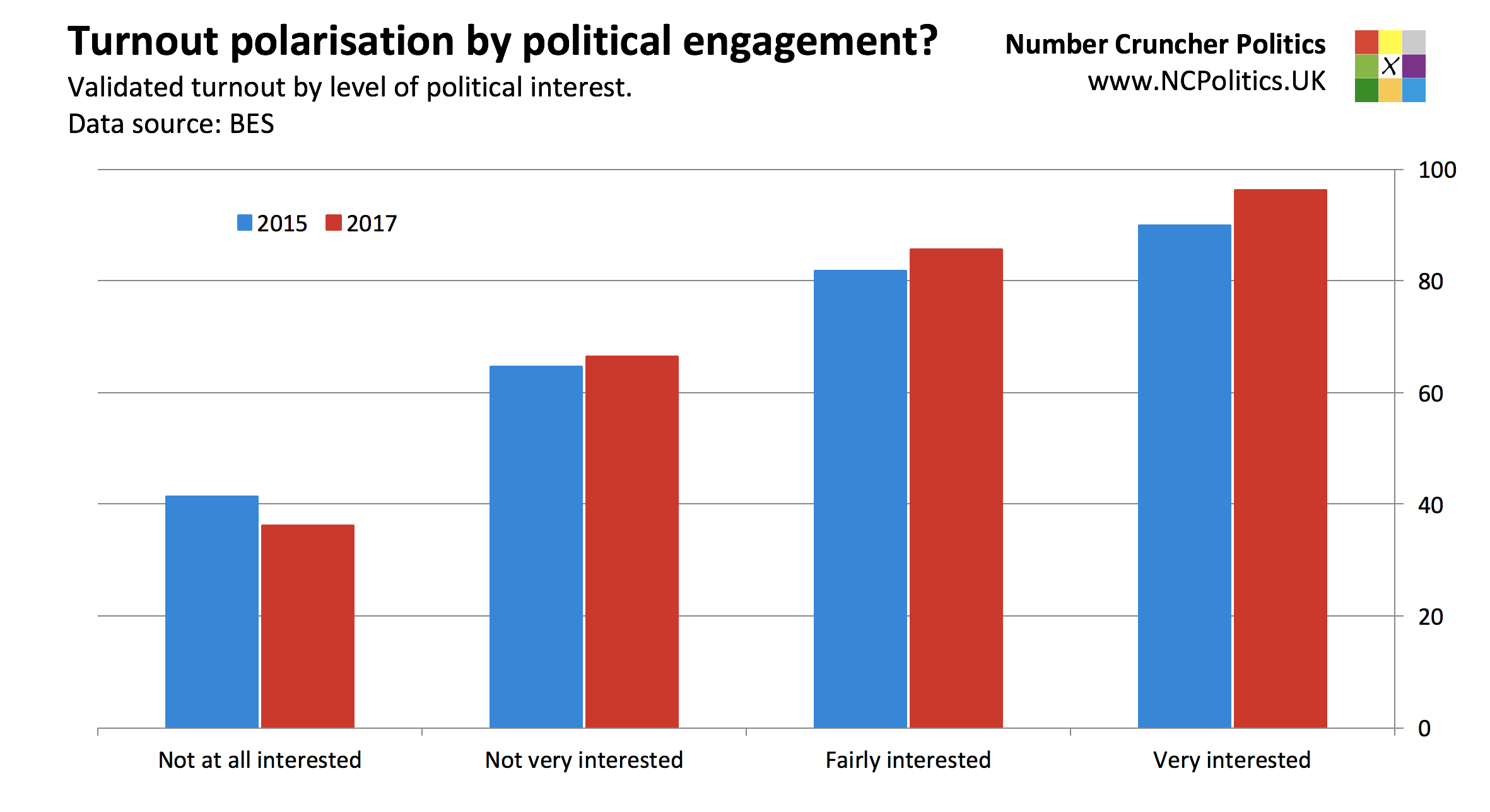 Wrong. Turnout among the most interested in politics increased even further compared with 2015, but among the least interested, it fell further.